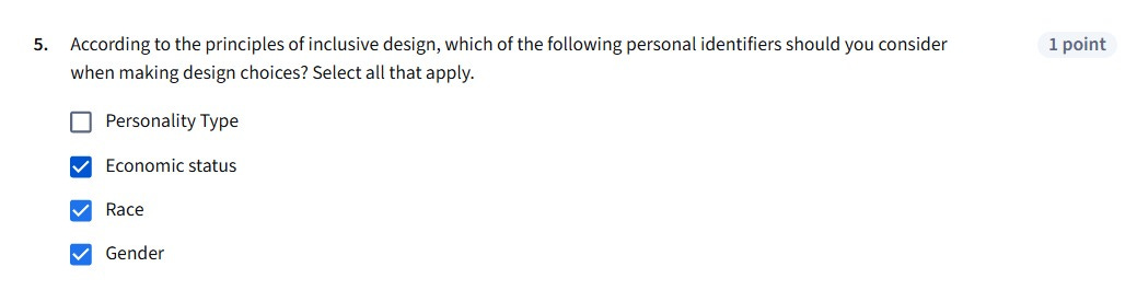 De acordo com os princípios do design inclusivo, quais identificadores pessoais a seguir você deveria considerar ao fazer escolhas de design? Selecione todos que se aplicam.